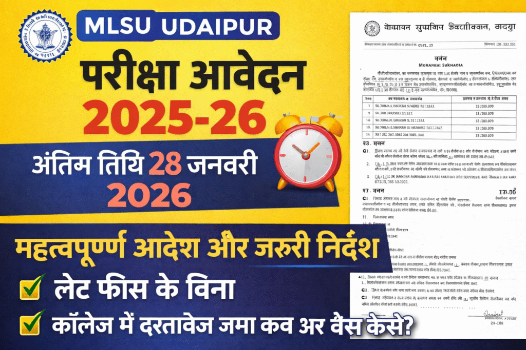 मोहनलाल सुखाड़िया विश्वविद्यालय (MLSU), उदयपुर द्वारा शैक्षणिक सत्र 2025-26 के लिए परीक्षा आवेदन को लेकर एक महत्वपूर्ण आदेश जारी किया गया है। यह आदेश विश्वविद्यालय की अधिसूचना संख्या 7 दिनांक 05.01.2026 और अधिसूचना संख्या 8 दिनांक 13.01.2026 के क्रम में जारी किया गया है।